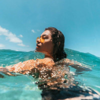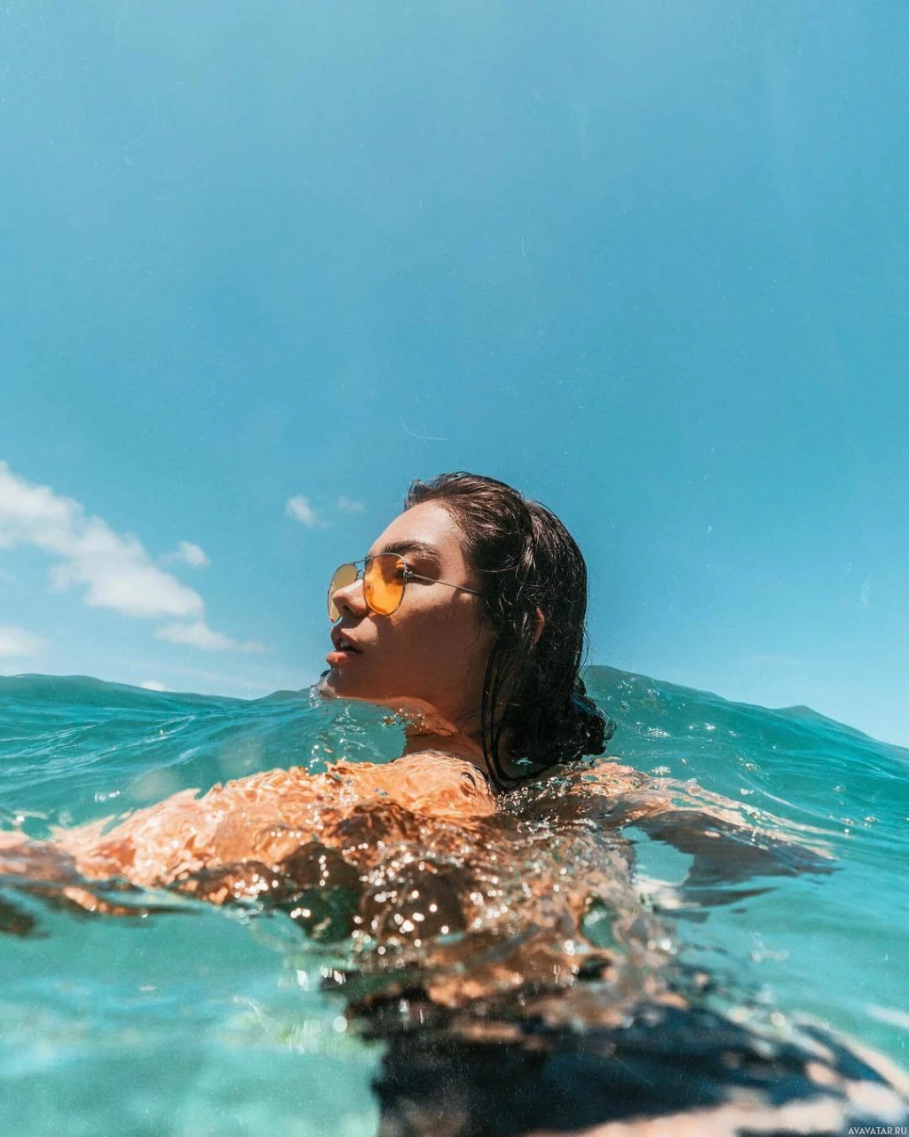 The image features a woman submerged in the ocean. She appears to be swimming, possibly surfing or snorkeling, and is wearing sunglasses. The water is clear, suggesting that she might be close to the shore, as there are no visible waves crashing around her. The sky above is a light blue color with some scattered clouds, indicating fair