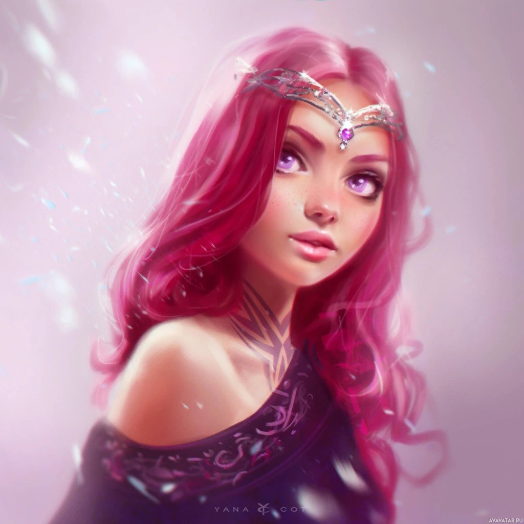 a fair complexion and is wearing what appears to be an elaborate headdress or headpiece, suggesting she might be portraying a royal or magical role. Her expression is gentle yet confident, looking directly at the viewer. The background has a soft, pinkish hue with small sparkles or particles around her hair and shoulders, adding