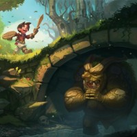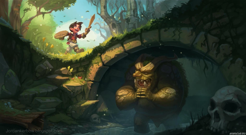 a cave entrance with a sense of anticipation or adventure. Inside the cave, there's a troll waiting by the entrance, looking menacing due to its