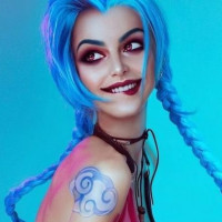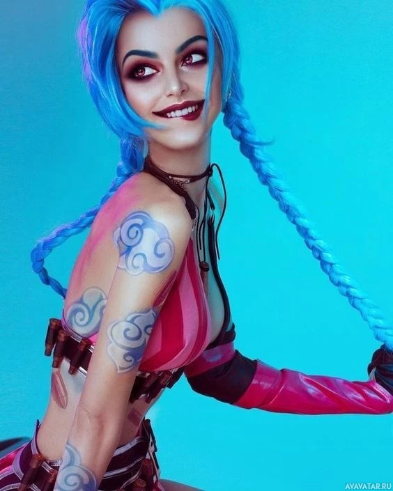The image features a person dressed as Jinx, a character from the popular