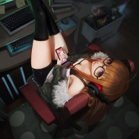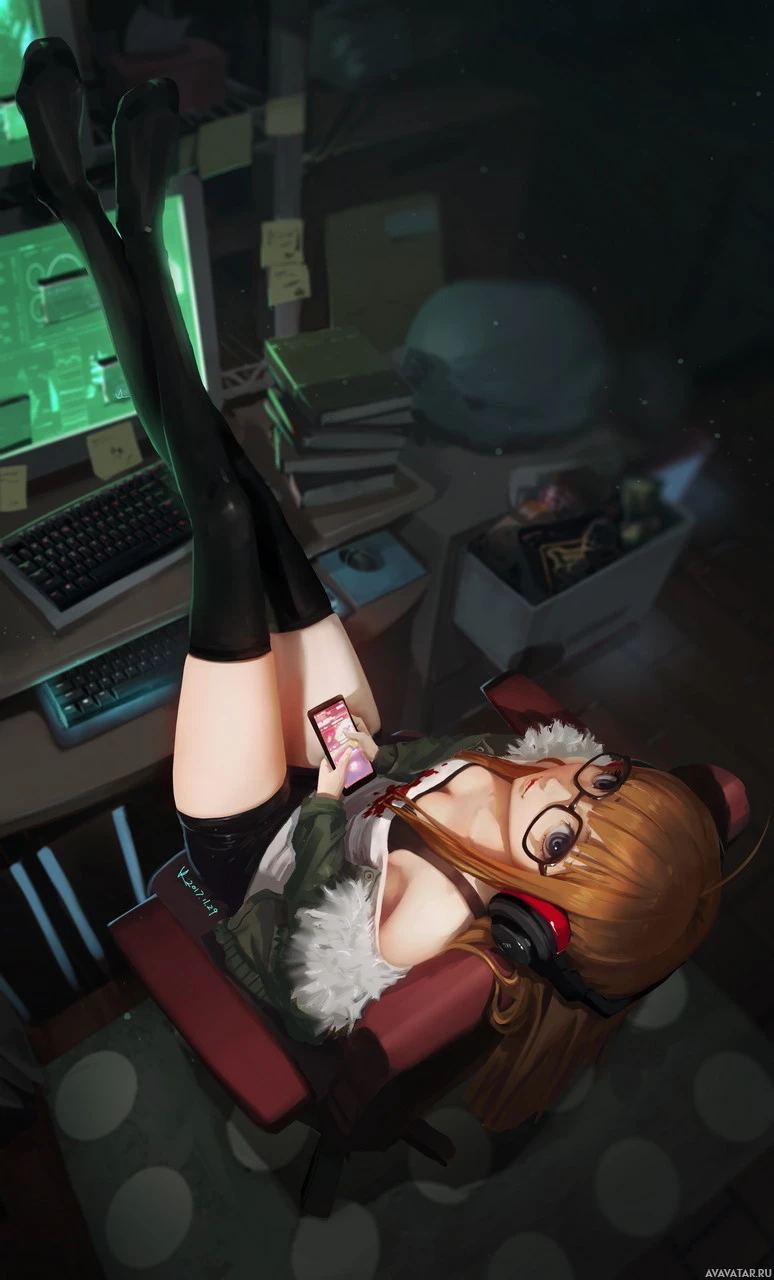 relaxed atmosphere, possibly indicating that she's taking a break from work or gaming activities.