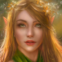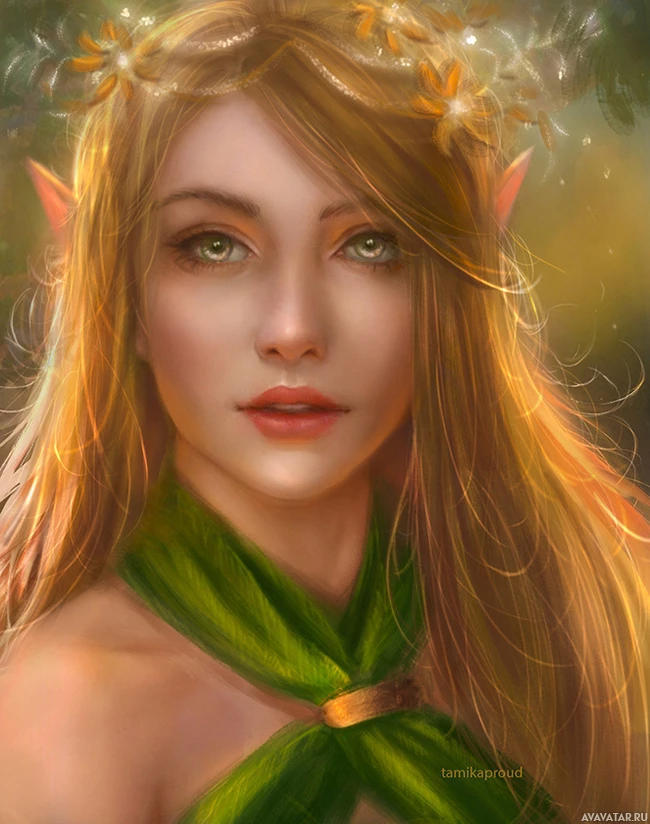 blonde hair and green eyes, which are common traits for elves in fantasy media. She is adorned with what seems to be leaves or decorative elements in her hair, suggesting