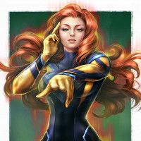The image depicts a female character known as Jean Grey from the X-Men comics and movies. She is shown wearing a costume that includes blue and yellow elements, reminiscent of her Phoenix persona. Her hair is styled in loose waves, and she has a determined expression on her face. The background is minimalistic with green accents at the bottom.