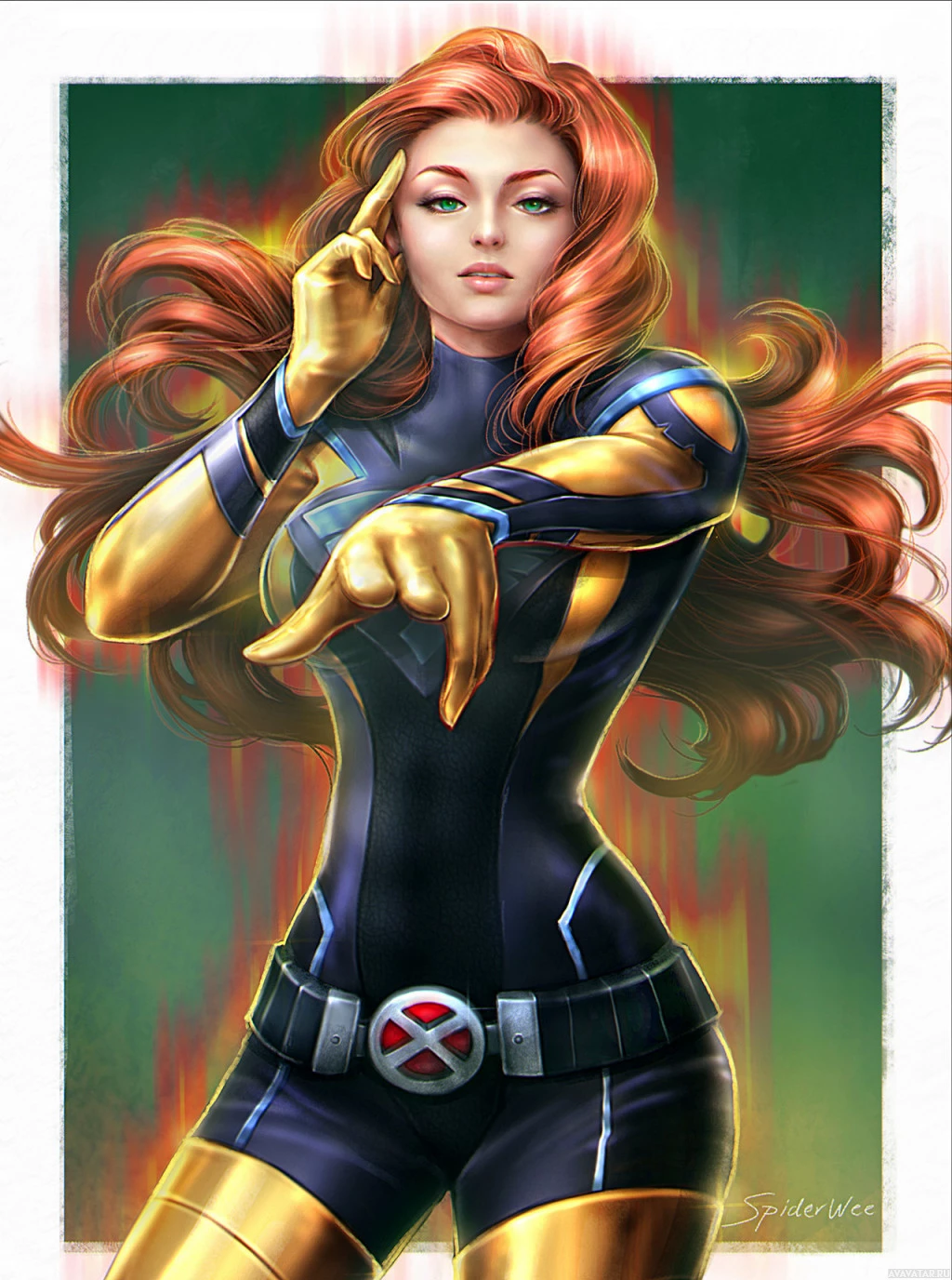 На картинке изображен женский персонаж, известный как Джин Грей из комиксов и фильмов о Людях Икс. Она изображена в костюме, который включает в себя синие и желтые элементы, напоминающие ее персону Феникса. Ее волосы стилизованы в свободные волны, и она имеет решительное выражение на лице. Фон минималистичный с зелеными акцентами внизу.