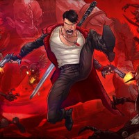 a leather jacket and have a confident expression on their face, looking forward as if ready to engage with opponents or continue an adventure. The background is red with