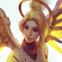 This is an image of Mercy, a character from the video game Overwatch. She is depicted with her typical blonde hair and wings, which are part of her character design. Her attire includes a white suit with orange accents, and she is known for being a support hero in the game.