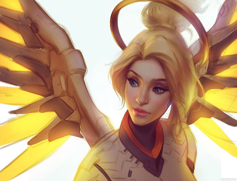 Это изображение Мерси, персонажа из видеоигры Overwatch. Она изображена со своими типичными светлыми волосами и крыльями, которые являются частью ее дизайна персонажа. Ее одежда включает белый костюм с оранжевыми акцентами, и она известна тем, что является героем поддержки в игре.
