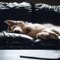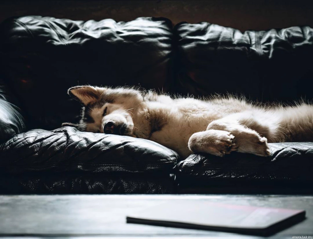 an adult dog, possibly a wolf-like breed given its size and features. The dog is curled up in