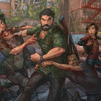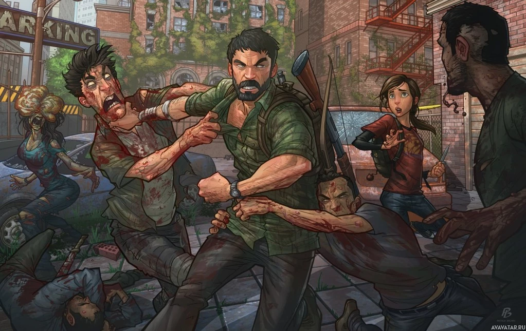 the video game "The Last of Us," featuring characters in a zombie-infested urban environment. The characters are engaged in combat, with one character aiming a shotgun at another. There are