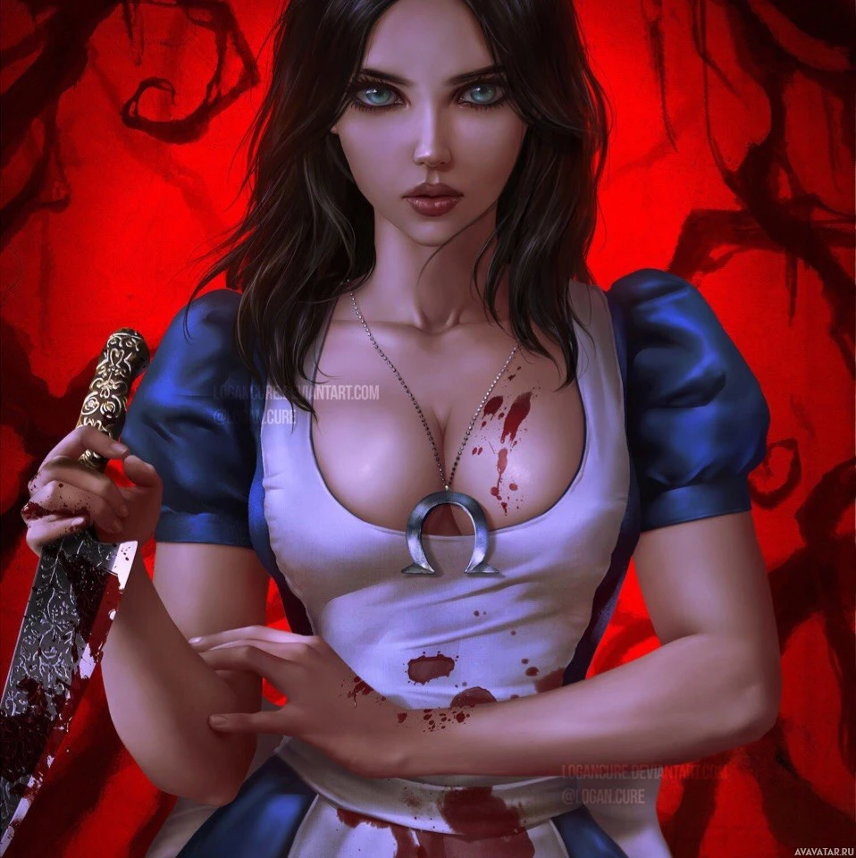 Alice in Wonderland." She is depicted with a darker, more gothic twist. Instead of the traditional blue and white dress, she wears a black and red outfit with