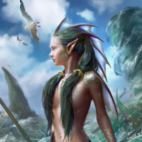 green hair and is standing on what appears to be an underwater surface, surrounded by waves and sea creatures. In her hand, she holds a trident, which is often associated with characters from mythology or fantasy tales. The overall composition of the image suggests a theme of fantasy and mythical
