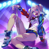 a female character who appears to be inspired by the popular DC Comics villain Harley Quinn. The character is depicted in a playful and flirtatious pose, sitting on a disco ball with one leg stretched out while wearing a bright