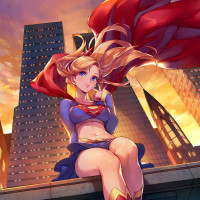 an animated character who resembles Supergirl from the DC Comics universe. She is depicted with a cape, a costume that includes a blue and red bodysuit with a yellow emblem on her chest, and she has