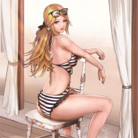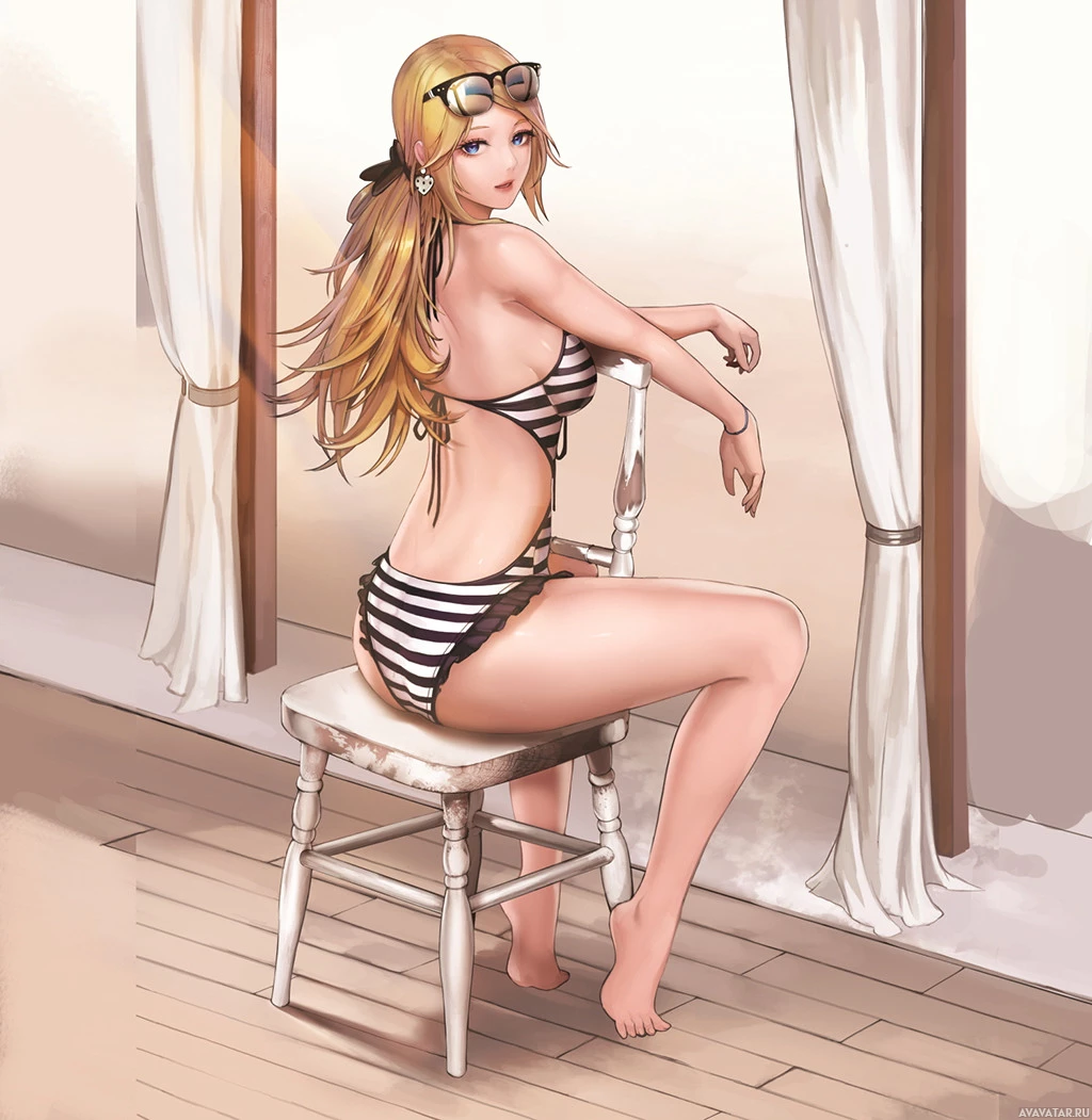 blonde hair wearing a bikini. She is sitting on a chair and appears to be looking out a window or through the doorway, as there are curtains partially pulled back. The style of the artwork is typical for Japanese manga or anime, characterized by its
