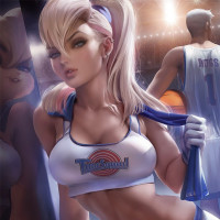 basketball player dressed in a jersey with the number 1. He seems to be looking at the girl with concern while standing near the court's foul line. The artwork is vibrant and detailed, featuring various elements that suggest it could be part of a larger narrative or storyline.