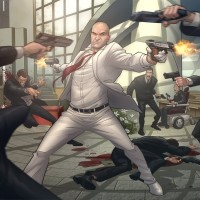 the video game "Hitman," featuring an animated version of Agent 47, the protagonist, in a standoff with several other characters. Agent 47 is dressed in his signature