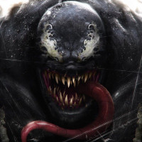 The image shows the character Venom, known for his symbiotic relationship with the Spider-Man character. Venom is depicted as a dark and menacing figure with sharp teeth, pointed ears, and a muscular humanoid body structure. His signature white spider emblem is visible on his chest.