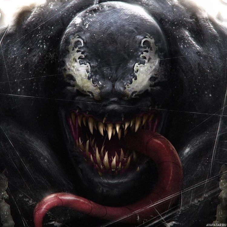 На картинке изображен персонаж Веном, известный своими симбиотическими отношениями с персонажем Человека-паука. Веном изображен как темная и угрожающая фигура с острыми зубами, заостренными ушами и мускулистой гуманоидной структурой тела. Его фирменная эмблема белого паука видна на груди.
