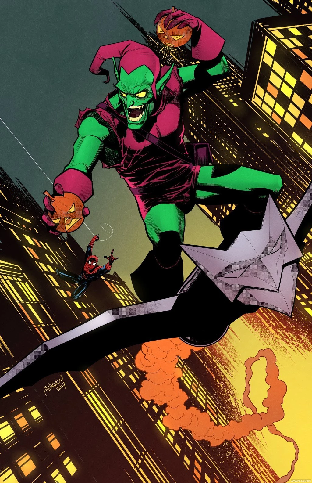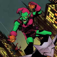Green Goblin's costume, adding a dynamic element to the scene. Both characters are depicted within what looks like a stylized