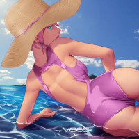 leisure time at the beach. The character's design appears to be influenced by anime or manga styles, which are popular in Japanese art and animation.
