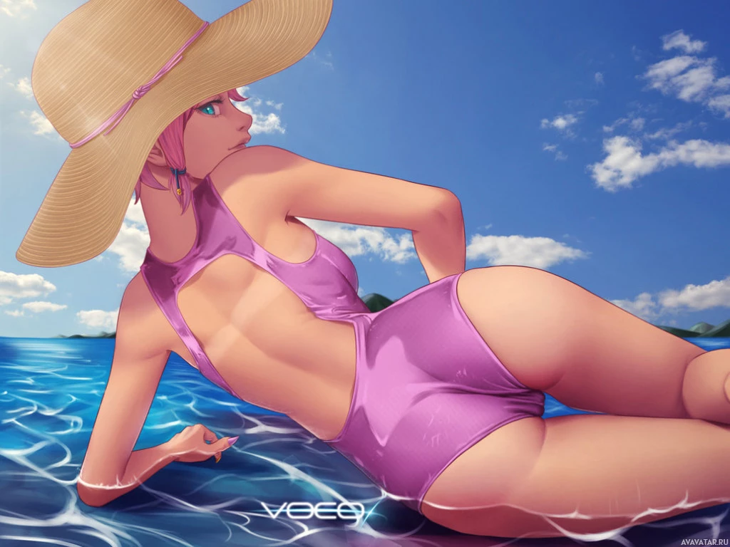 The image shows a character wearing a pink swimsuit, sitting by the water's edge on