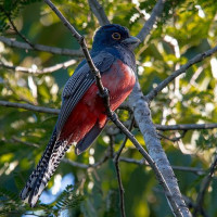 blue head and back with a vibrant red breast and wingtips that contrast against its darker wings and tail. It appears to be looking off to the side, possibly observing its surroundings or scanning for food. The bird's feathers are neatly arranged, indicating it may be a species known for its