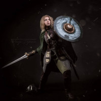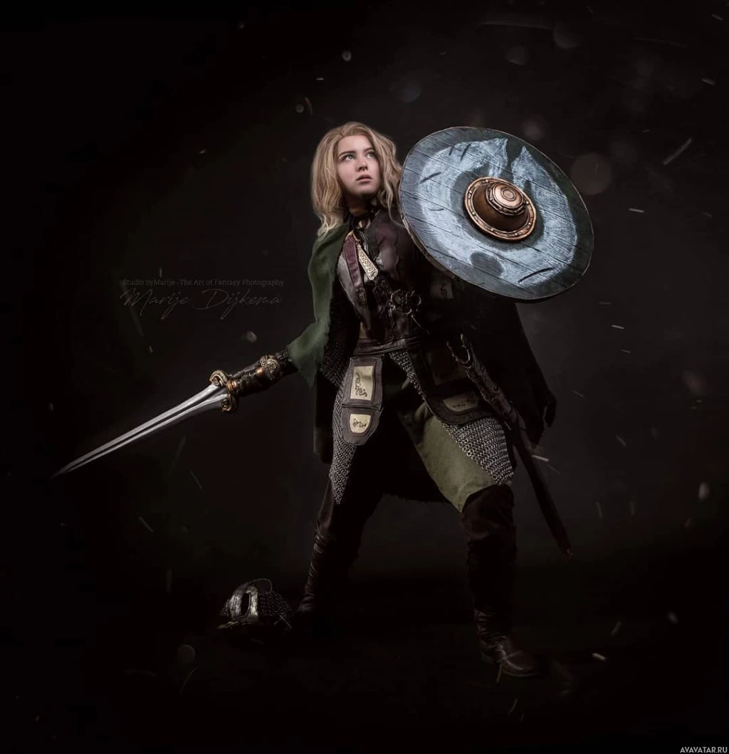 cosplay attire inspired by characters from "Lord of the Rings." They are wearing armor and carrying weapons that seem to be typical for such a character, suggesting they are portraying a warrior or knight from the series. The costume includes