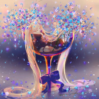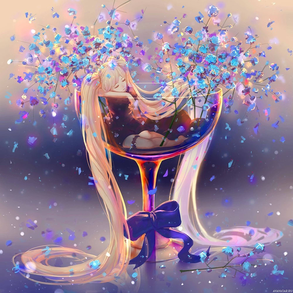 blonde hair. She appears to be lying down in a glass filled with