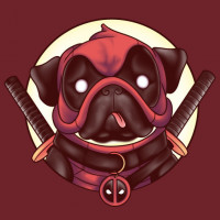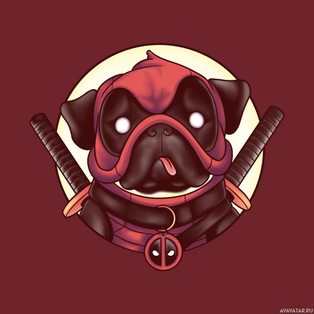 The image features a cute pug dog dressed as Deadpool, a popular