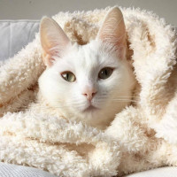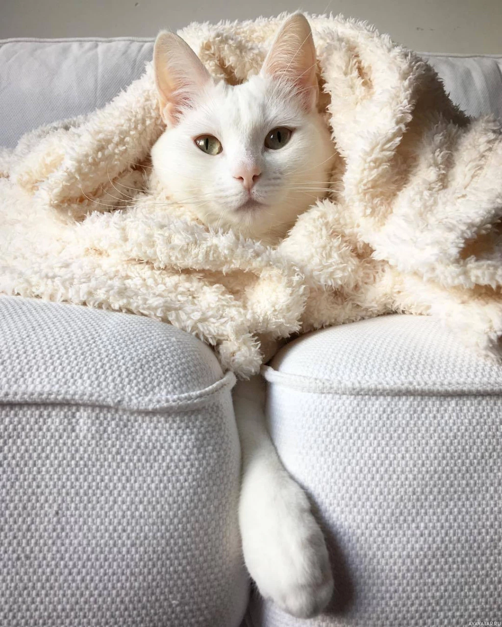 green eyes. It appears to be comfortably settled on a couch, wrapped in a light-colored blanket that gives it an almost human-like appearance of being swaddled or snuggled up for warmth. The cat's position and