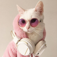 The image features a cat wearing sunglasses and headphones. It is dressed in a pink, fuzzy
