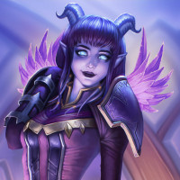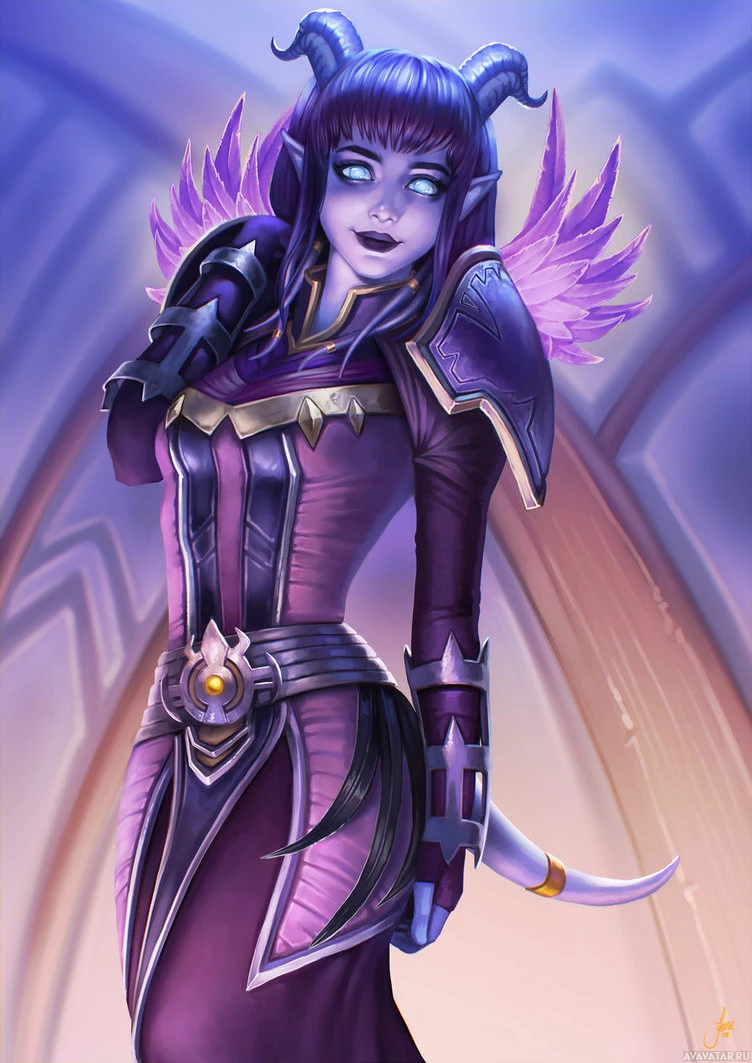 На картинке изображен персонаж из игры «Warcraft». Она имеет фиолетовые волосы и носит доспехи, которые предполагают, что она может быть из расы дреней, которые известны своими рожками и потусторонним внешним видом. Ее одежда имеет сочетание фиолетового и черного цветов, с замысловатыми деталями, которые подразумевают уровень сложности или важности в ее контексте в игре. Фон нейтральный, фокусирующий внимание на персонаже.