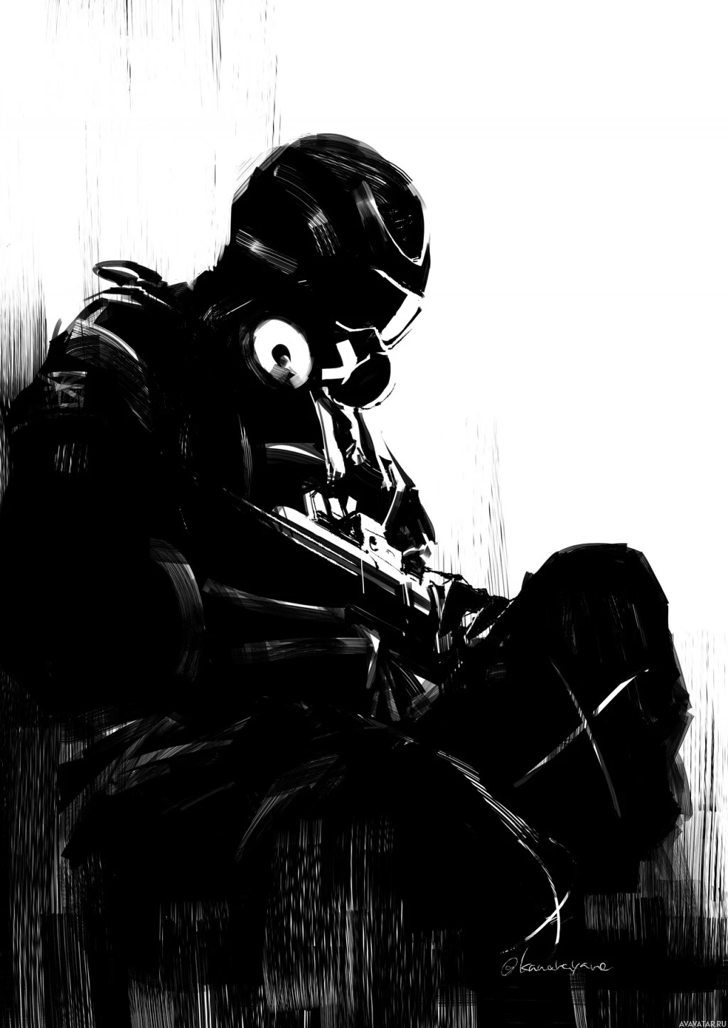 a contemplative state or perhaps resting during a break in combat activity. The overall atmosphere of the image conveys a sense of solitude and introspection amidst what could be interpreted as a conflict scenario, suggested by the presence of a weapon and
