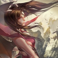 the fantasy atmosphere of the image. The character's pose is dynamic, with her hair flowing in the wind and one hand gripping