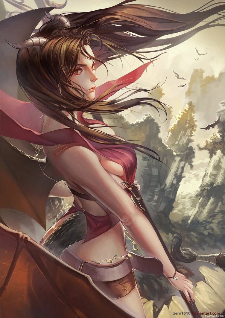 dark hair, red eyes, and a prominent pair of wings. She is dressed in what appears to be an armor or garment with