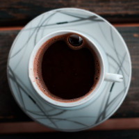a cup of coffee, which appears to be hot chocolate or a similar dark-colored liquid, possibly with a dollop of whipped cream on top. The cup is sitting on a table with a marbled pattern, and there's also