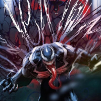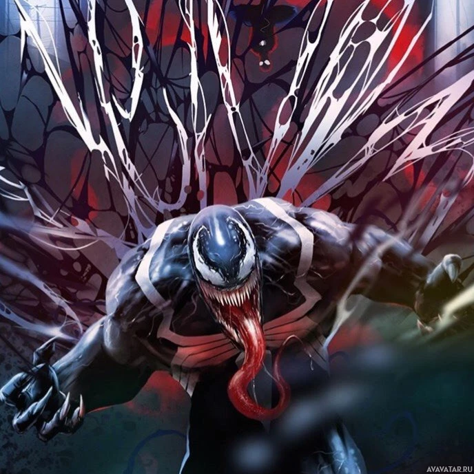 black suit and white spots, which represent the symbiote that merges with the human host. The background has an explosive or fiery design, contributing to