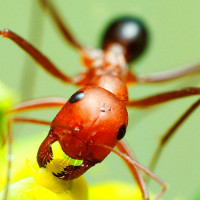 a worker ant, as indicated by its size and the absence of wings, typical characteristics for female ants that do not fly. The ant is standing on the edge of what seems to be