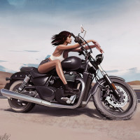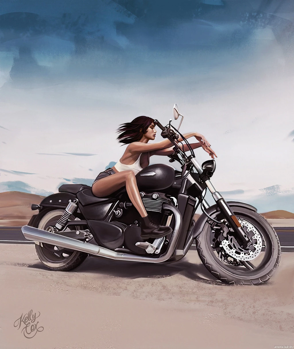 The image features a woman sitting on the side of a motorcycle. She appears to be wearing