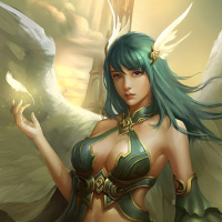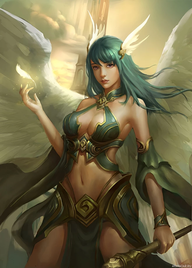 The image depicts a fantasy-style illustration of an angelic figure with