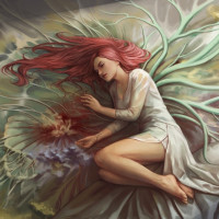 white fabric that resembles a dress or a shawl. There are also elements such as flowers and what appears to be roots or foliage near her, adding to the ethereal and dreamlike quality of the image. The colors are soft and pastel-toned, contributing to a gentle and serene atmosphere.