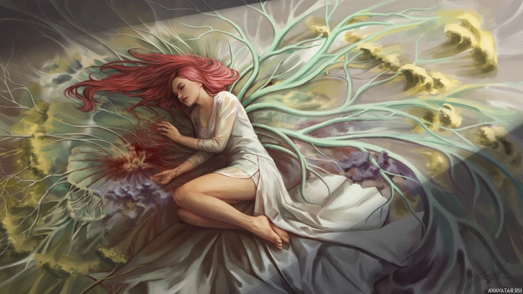 red hair that spills out onto the surface beneath her. Her attire includes flowing
