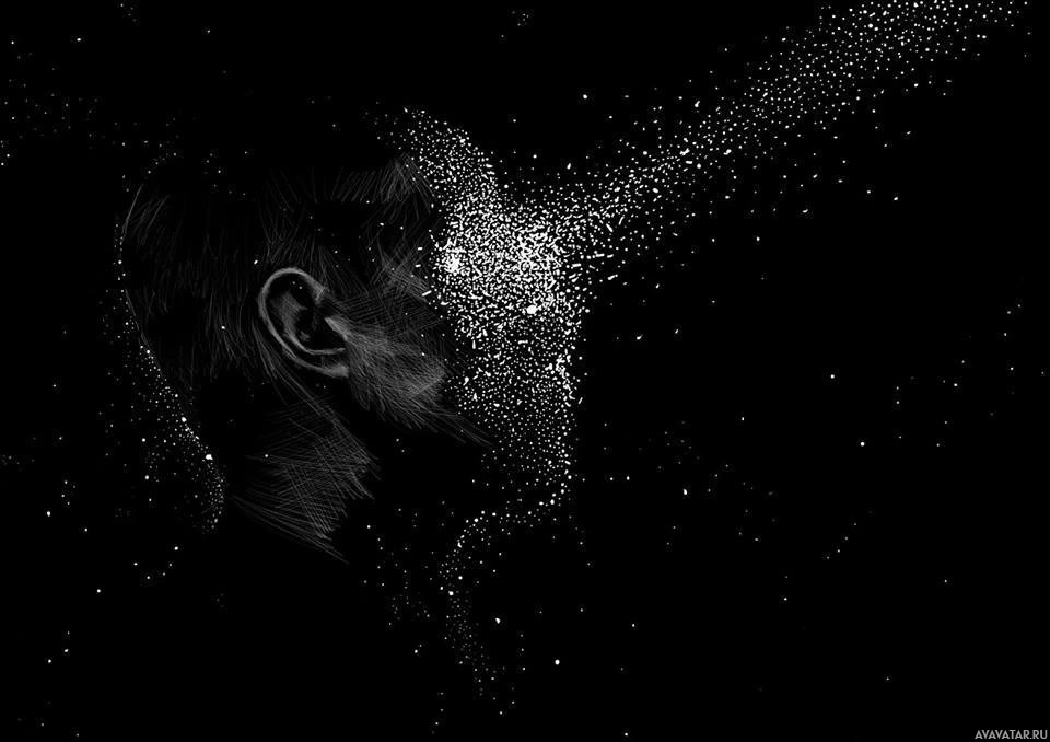 face in profile, with what appears to be particles or sparks emanating from the nose and mouth area. It gives the impression that the person is creating or generating something. The background is dark, providing contrast to the figure. This artistic representation could symbolize