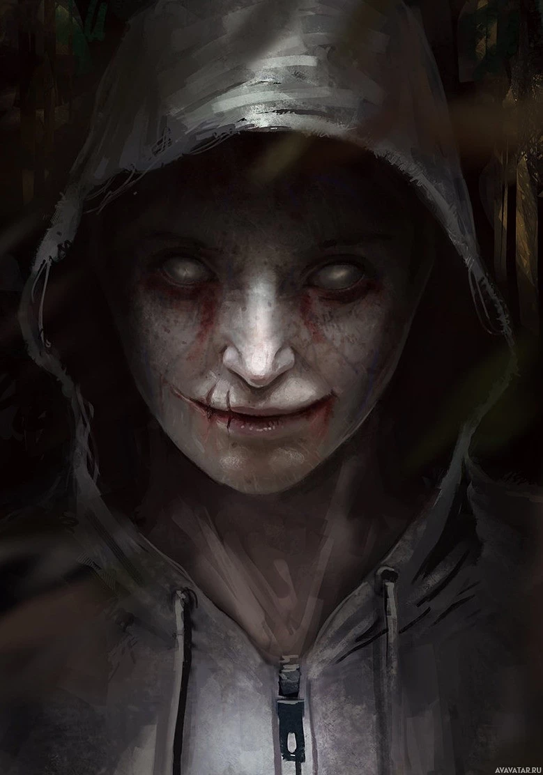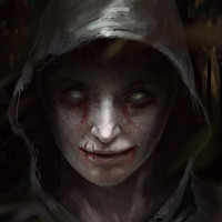 a hooded cloak. They have a distorted, haunting expression on their face and