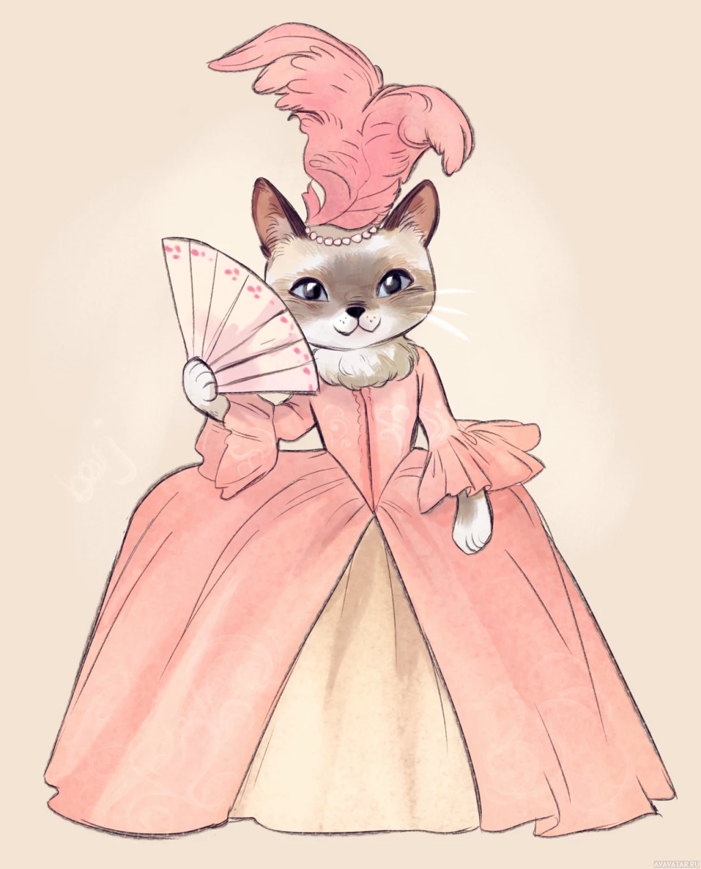 an elegant gown, complete with a feather headdress. The cat has