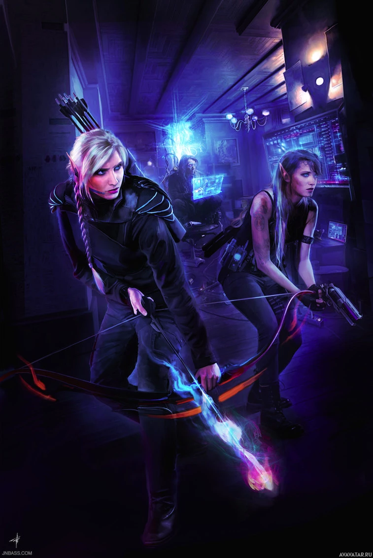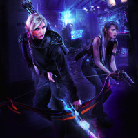 character on the left is dressed in what appears to be futuristic or science fiction attire, suggesting a setting that combines elements of fantasy with technology. The character on the right has a more traditional look and holds her bow in a manner reminiscent of an elf from