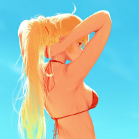На картинке изображен персонаж, нарисованный в стиле аниме или манги. Персонаж выглядит как молодая девушка со светлыми волосами и одета в красное бикини. Она изображена на солнечном фоне, возможно, предполагая пляжную обстановку.