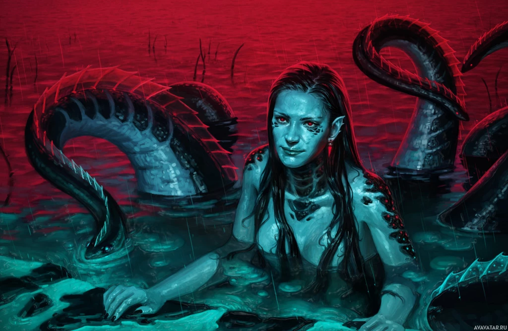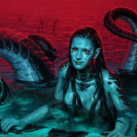 The image depicts a fantasy-themed artwork featuring two octopuses with humanoid features, such as eyes and mouths. One of the octopuses has human-like arms, while the other appears to be more traditional in appearance. A woman is situated between these two creatures; she seems calm or even serene, despite being surrounded by the octopuses. Her expression is neutral, and there is