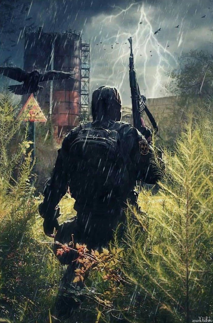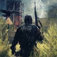 rain gear and carrying a weapon, possibly indicating they are involved in some sort of combat or survival situation, similar to the game "S.T.A.L.K.E.R.: Shadow of Chernobyl" where players navigate post-apocalyptic environments facing various hazards including radiation, mutants, and extreme