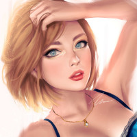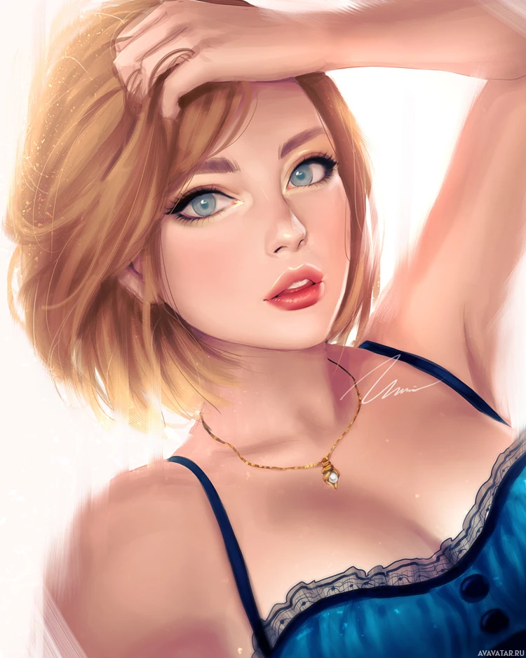 a blue dress with a white lace collar, suggesting a casual or elegant attire. Her pose and expression give off a relaxed and confident vibe. The artwork is detailed and colorful, showcasing the artist's skill in creating realistic-looking characters within